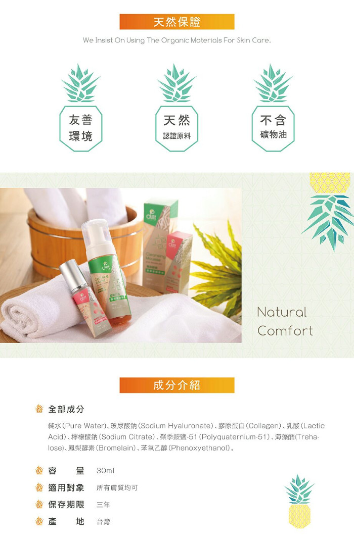 添加天然果實萃取而成的鳳梨酵素, 可舒緩臉部乾燥與不適膚況,讓肌膚光華細緻。 高純度玻尿酸與膠原蛋白與糖基海澡醣為基底的三重保溼, 快速補充肌膚所需水分與長時間保溼, 鎖住水分不流失,喚醒肌膚明亮, 給予超水感水嫩肌。無香料配方, 讓自然保水細緻肌膚呈現最天然的美麗!